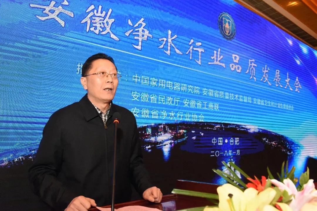 本次大會由安徽省凈水行業協會主辦,得到了中國家用電器研究院、安徽省質量技術監督局、安徽省衛生和計劃生育委員會、安徽省民政廳、安徽省工商聯等單位的大力支持。中國家用電器研究院測試計量技術研究所所長魯建國、凈水器性能研究與測試中心主任王統帥,安徽省工商聯黨組成員、副主席兼秘書長李俊波,安徽省民政廳民間組織管理局副局長闞家安,安徽省質量技術監督局監督處處長程波,安徽省衛生廳衛生監督所監督處處長李軍,安徽省質量技術監督局質量監督檢驗中心主任潘建,山東家電行業協會水處理設備專委會秘書長董信,河北省商業聯合會凈水行業專委會會長、《中國直飲水》總經理梁上音以及協會會長王六一、秘書長柳敏等人出席了大會。大會還吸引了省內外百余家凈水企業和經銷商近200人的熱情參與。