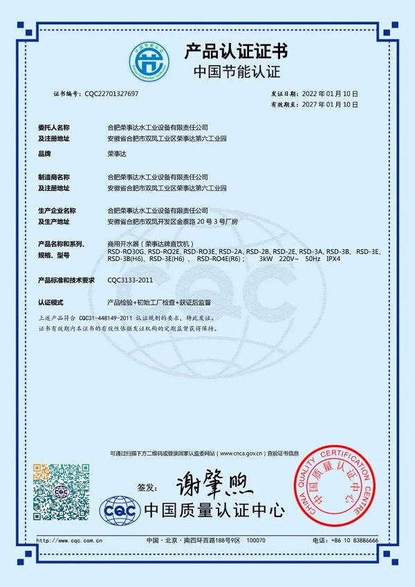 榮事達(dá)RSD-RO3E直飲機和榮事達(dá)RSD-RO2E幼兒園機均采用節(jié)能熱交換技術(shù),省時省電,實現(xiàn)了節(jié)能環(huán)保理念,獲得了中國節(jié)能認(rèn)證。