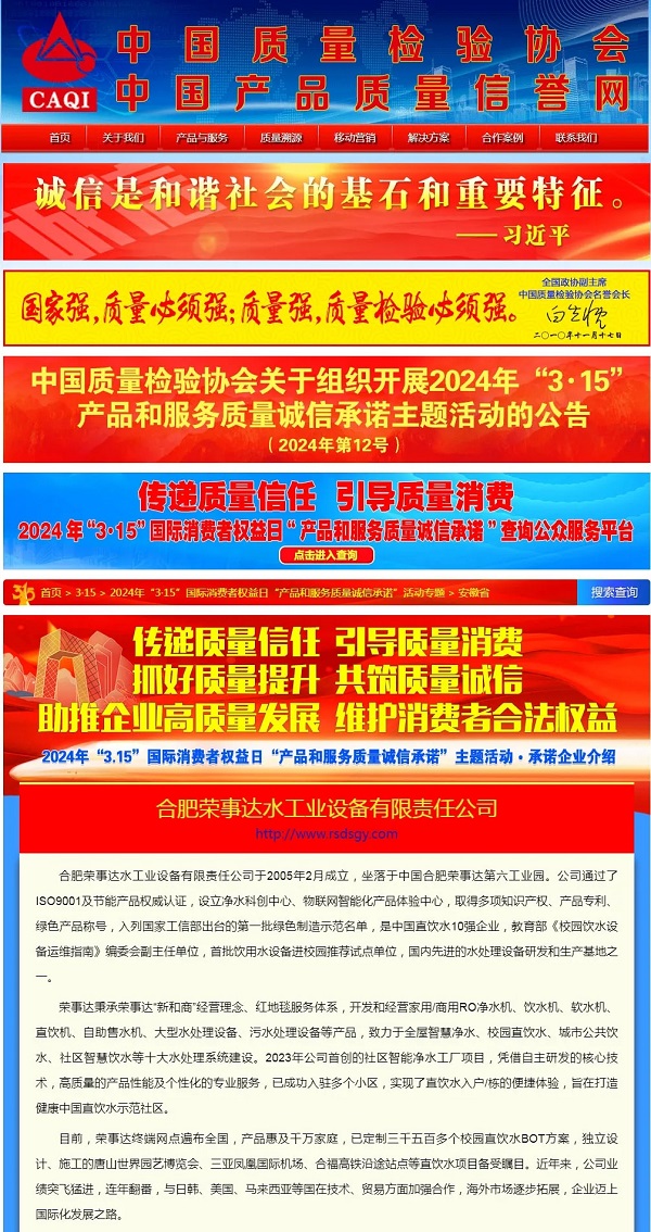 傳遞質量信任,引導質量消費。 在由中國質量檢驗協會主辦的2024年“3·15”產品和服務質量誠信承諾的主題活動中,榮事達水工業公司憑借卓越的產品品質及良好的社會形象,獲得協會以及權威專家的一致認可,榮膺 “全國產品和服務質量誠信示范企業 ”“全國凈水行業質量領先企業”“全國凈水行業質量領先品牌”“全國產品和服務質量誠信品牌”“全國質量檢驗穩定合格產品”“全國質量檢驗信譽保障產品”“全國消費者質量信譽保障產品 ”多項榮譽。