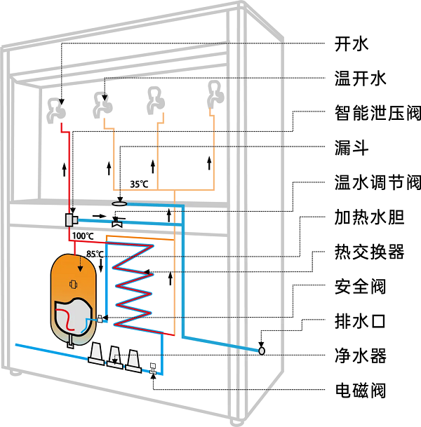 榮事達RSD-RO4E節能直飲機是中國節能認證產品,產品采用節能熱交換技術,在管式交換器內,過濾后的自來水吸收開水釋放的熱能升溫85℃左右,從而充分節省了降水燒開所需的電能和時間,有效改善了傳統飲水機的費時、費電的弱點。設備采用二開水二溫水設計,既滿足了員工泡茶的需求,也提供了即飲的溫水選項,極大地方便了員工的日常飲水。此外,設備采用先進的RO反滲透技術,有效濾除水中的泥沙、鐵銹、重金屬等雜質,出水可達直飲標準。
