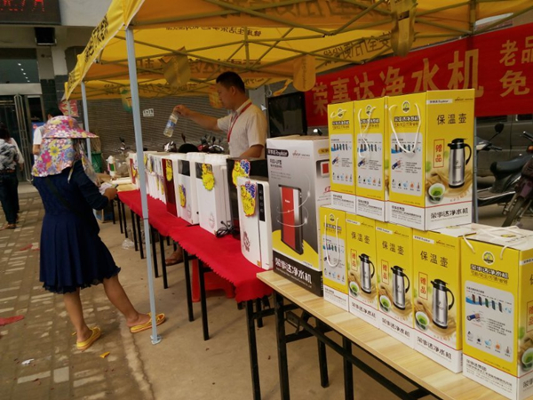 •     5月26日,榮事達在河南信陽甘岸鎮開展“榮事達凈水機 入小區 下基層 送健康”活動,推廣健康飲水。榮事達凈水產品深受當地消費者喜愛,活動當天售出30多臺機器。