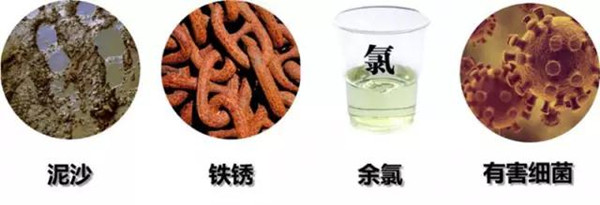 水由鍍鋅鐵管輸送,水與鐵發生氧化作用,生成紅色的氧化鐵,進一步氧化會生成黑色的三氧化二鐵。新建樓房中的管道更容易被氧化。幾乎所有的人都有這樣的經驗,每天早上第一次打開水龍頭,出水中發紅的物質即是鐵銹。鐵是人體必需的元素,但作為飲用水指標之一,每升水中鐵的含量不得超過0.3毫克。若肉眼能分辨出水中鐵銹的顏色,或是能品嘗出鐵銹的味道,那么水中的鐵含量是大大超標了,鐵含量超標,不僅觀感、口感差,長期飲用,會加重腎臟負擔,導致內分泌系統失調,高血壓等病癥。